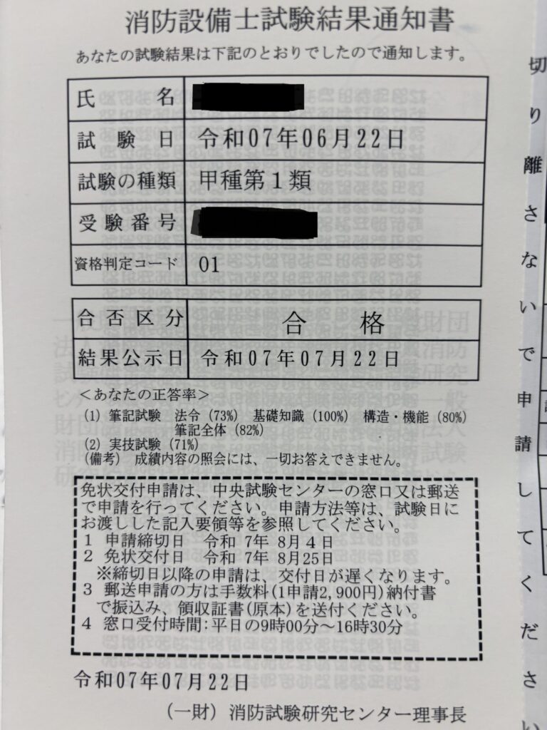 試験から6日後、ポストに一枚のはがきが入っていた。 表面には「消防試験研究センター」の文字。 開けるまでもなく、結果がわかるあの瞬間の緊張感。 裏面には、合格通知の文字と成績の詳細。 いわば“お便り”のような合格報告だった。